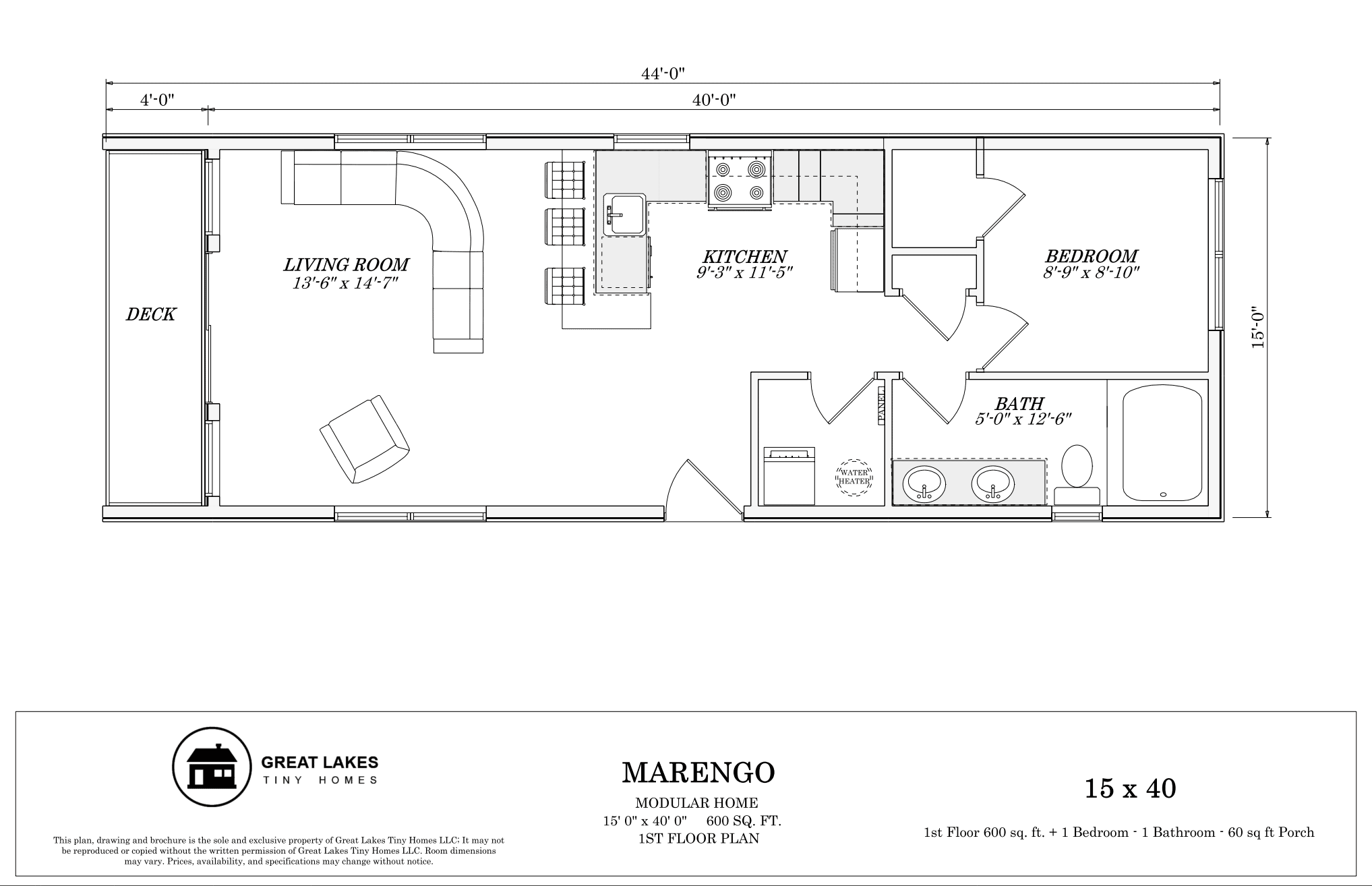 This thoughtfully designed 600 sq. ft. modular home features a spacious bedroom, full bathroom, well-equipped kitchen, open living area, and convenient laundry space—all on one level.