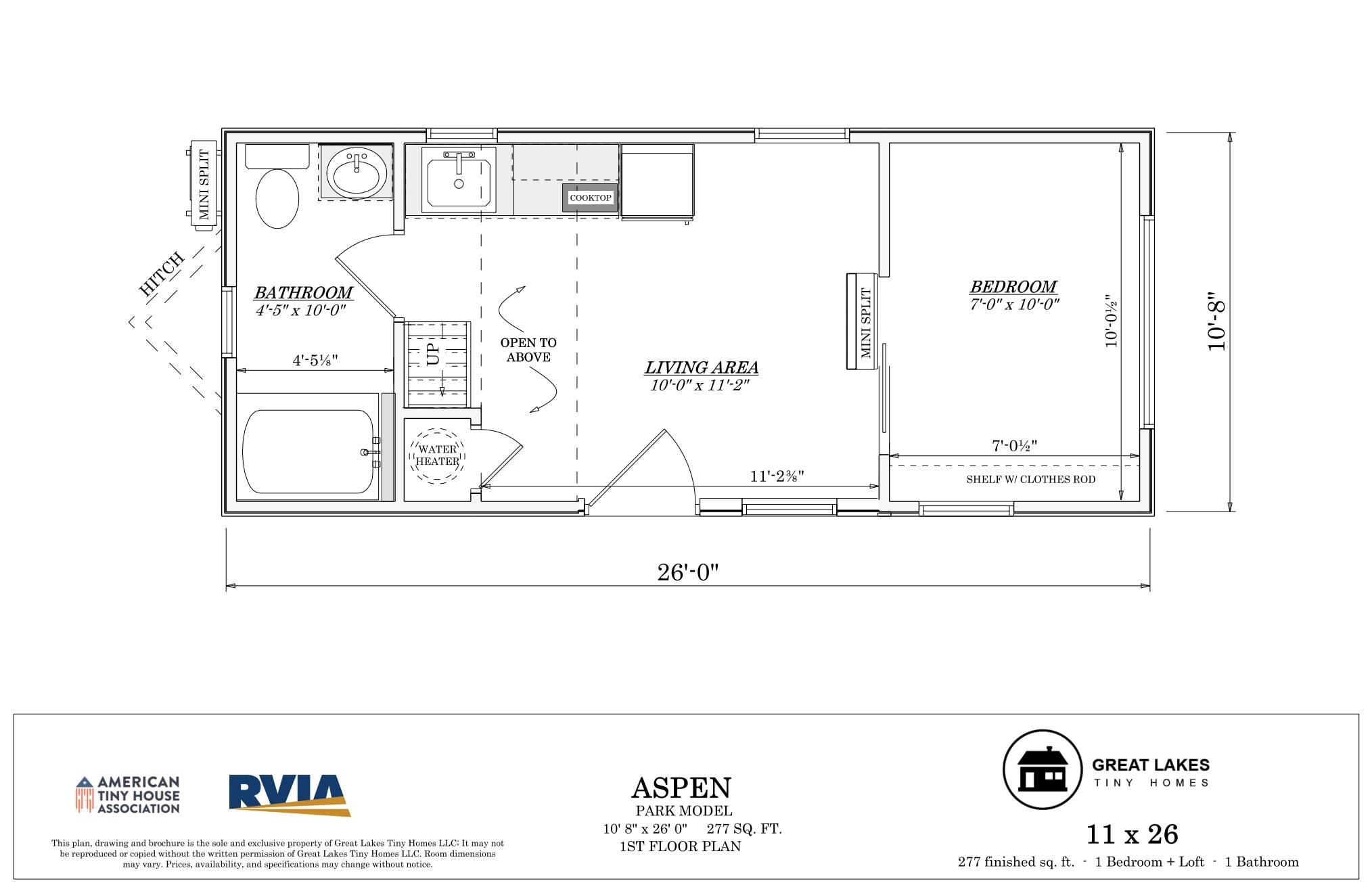 The Aspen is a 12′ x 26′ , 1 bedroom plus loft , 1 bath , finished on the inside with tongue & groove pine on ceiling & white MDF board on walls with Pine Trim , Kitchen has Birch Cabinets with Stainless Steel sink , Refrigerator & Microwave , master bedroom has a great picture window with shelf & clothe hanger rod , ladder leads to loft for storage and 2nd sleeping area , closet in living room behind loft ladder , mini split cooling & heating