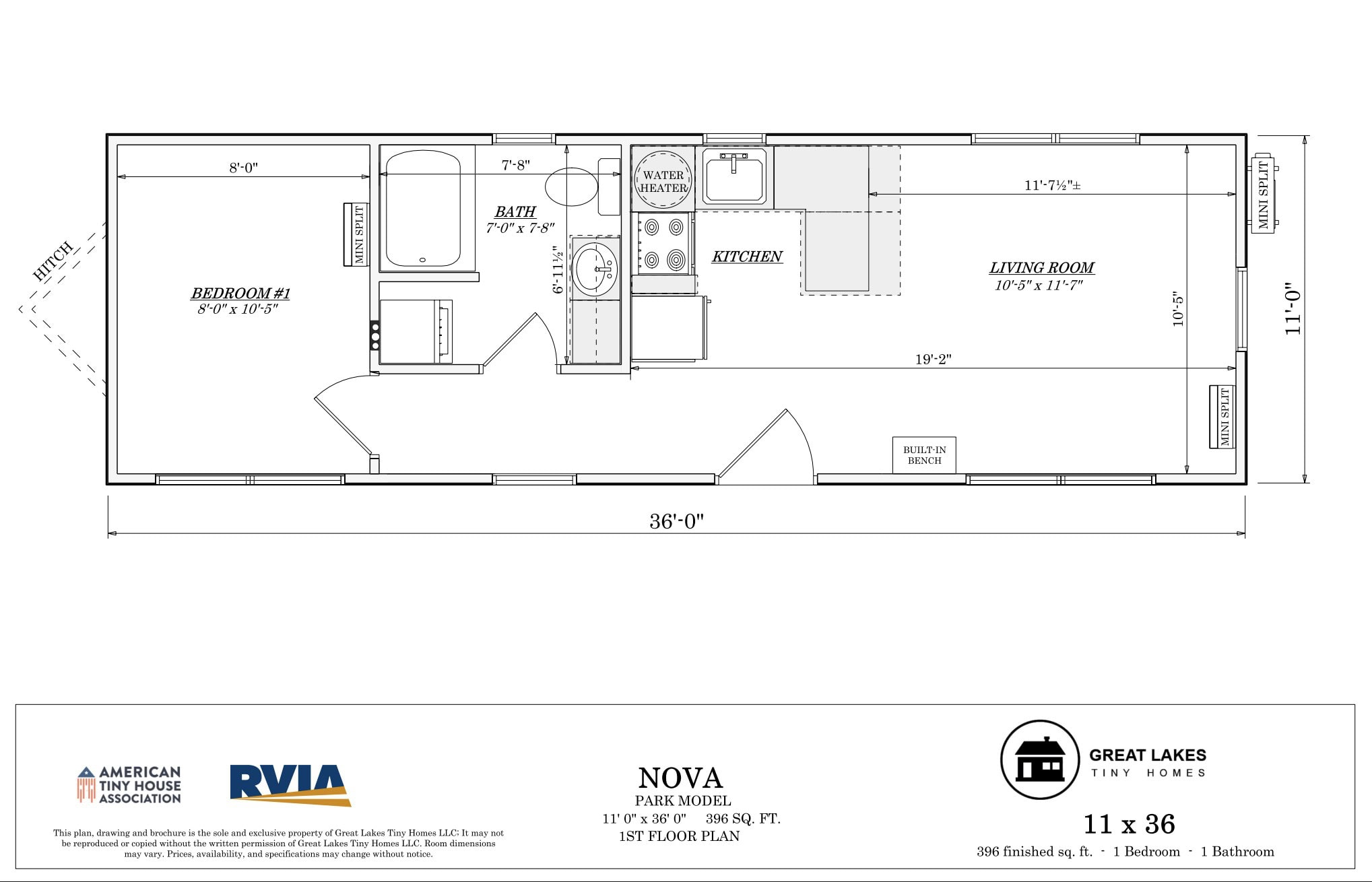 With a Beautifully Designed 1 Sided Roof & Modern feel, this is the Perfect Model for a Weekend Getaway or Airbnb/Rental Property while still having plenty of room for Long Term Living. The Nova comes equipped with a Large U-Shaped Kitchen, a Large Living Area, 1 Bedroom & 1 Bathroom.